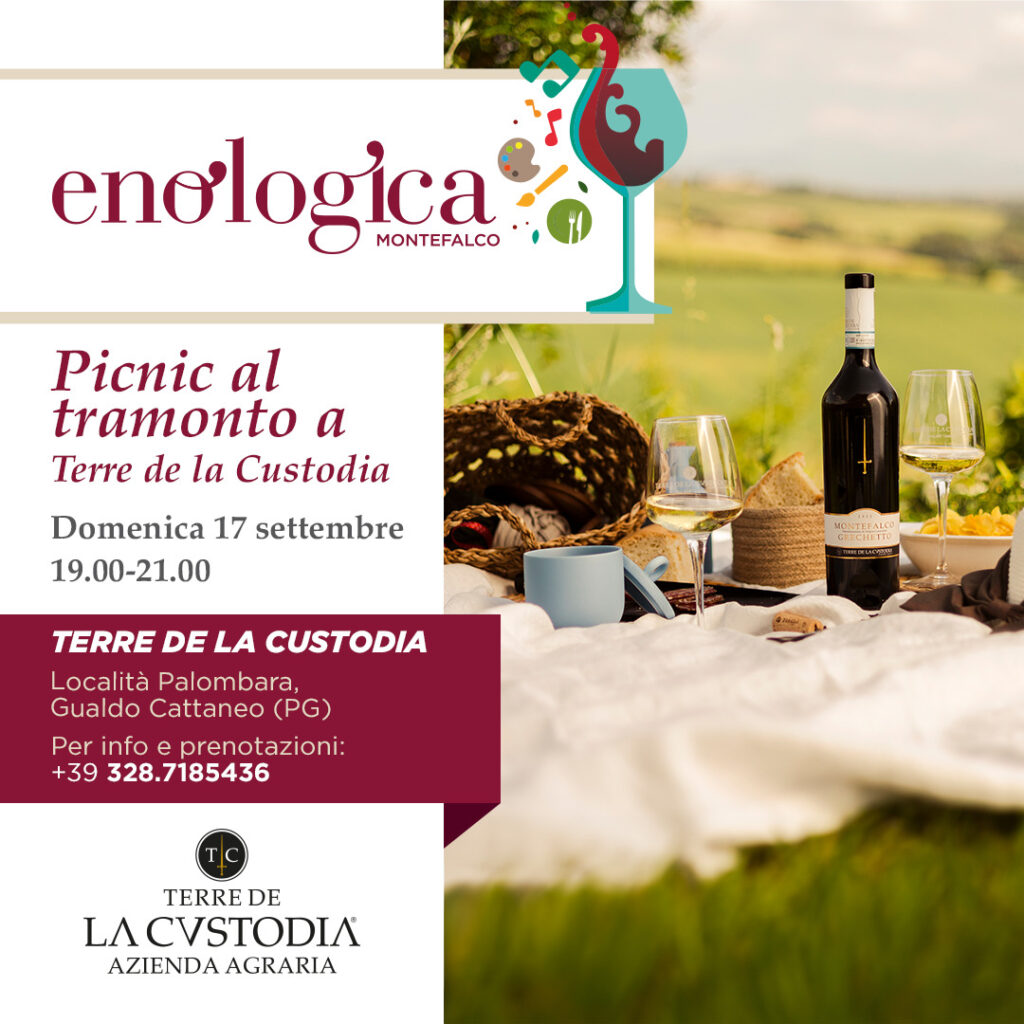 Per l’occasione, domenica 17 Terre de la Custodia organizzerà un appuntamento affascinante e imperdibile: un picnic nei suoi giardini, dalle 19:00 alle 21:00, per ammirare insieme il tramonto sulle vigne di Sagrantino assaporando i nostri vini.